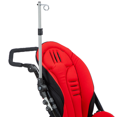 Acessório suporte de dieta consiste numa barra articulável para ser anexada na base do carrinho postural Chilla mantendo a dieta enteral em posição elevada, permitindo assim que ela flua por gravidade para garantir a nutrição adequada ao usuário.