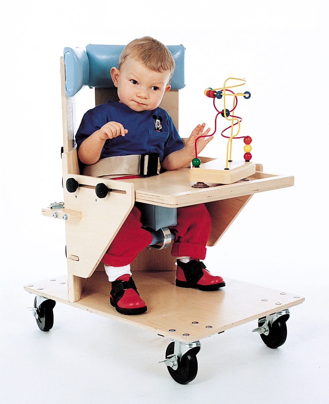 O encosto da cadeira Kaye C4C tem um acolchoado firme que converte o formato “V” em um formato de três lados, fornecendo maior suporte à mesma, dando maior extensão a espinha resultando em maior liberdade para cabeça e olhos para observar. Essa inserção pode ser removida fazendo com que as laterais da cadeira proporcionem apoio ainda maior aos braços e induzindo que eles sejam levados mais à frente na bandeja. O assento da cadeira pode ser elevado permitindo com que a criança fique com o quadril posicionado e os joelhos flexionados, ou pode ser utilizado numa posição mais baixa, para maior alongamento das pernas. O abdutor pode ser posicionado na parte da frente do assento, na parte distal dos fêmures, para manter a adução do quadril mesmo com o joelho flexionado ou estendido. Se o cinto estiver posicionado em torno do quadril, proporcionará maior estabilidade pélvica.