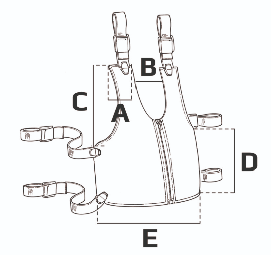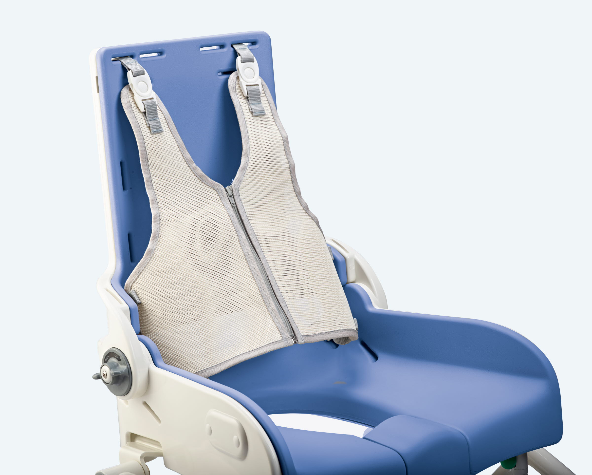 Acessório colete de tronco visa proporcionar estabilidade postural e segurança, mantendo o tronco alinhado do usuário na cadeira de banho e higiene Flamingo HL ou Heron firmemente posicionada e alinhada, prevenindo também possíveis deslizamentos e quedas.