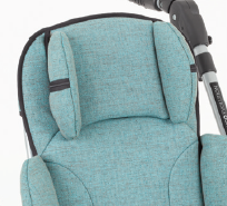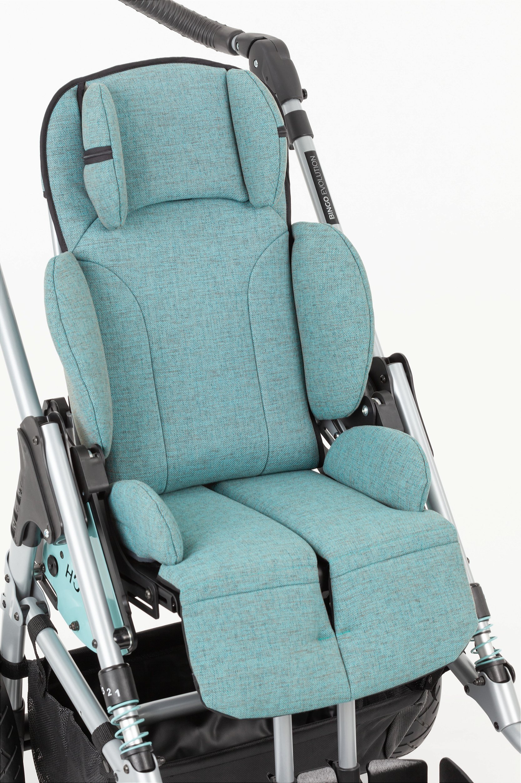 O descanso de cabeça possui sistema de ajuste de altura e largura no encosto do carrinho postural Bingo Evolution. Ele possui diversidade de cores de acordo com a coloração do conjunto da almofada escolhida (preta, azul turquesa ou rosa claro).