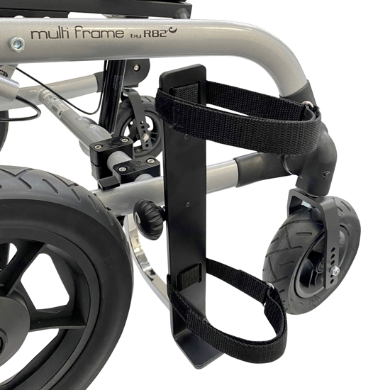 Acessório suporte de garrafa de oxigênio é facilmente montado verticalmente na estrutura da base da cadeira de rodas postural XPanda para receber a garrafa de oxigênio.