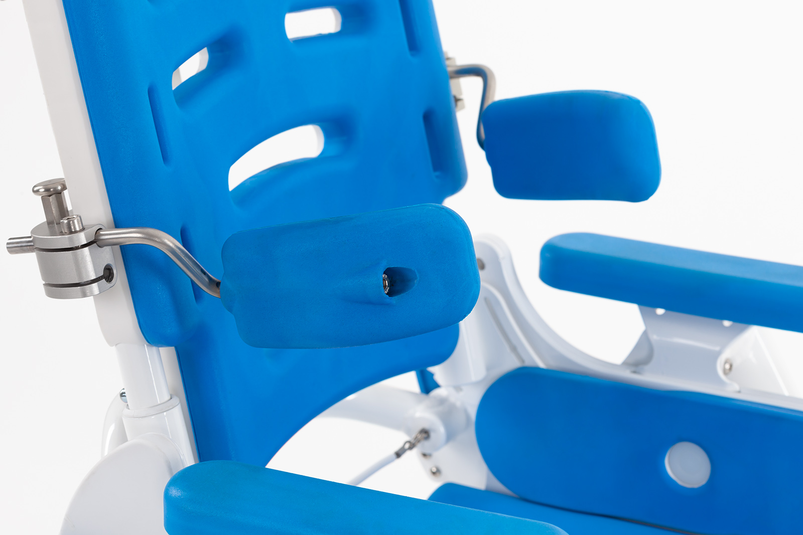 Acessório suporte de tronco abre-fecha (swing-away) para a cadeira de banho e higiene Sharky indicado quando há necessidade de manter um melhor alinhamento e suporte para o membro superior daqueles usuários com maior comprometimento motor.